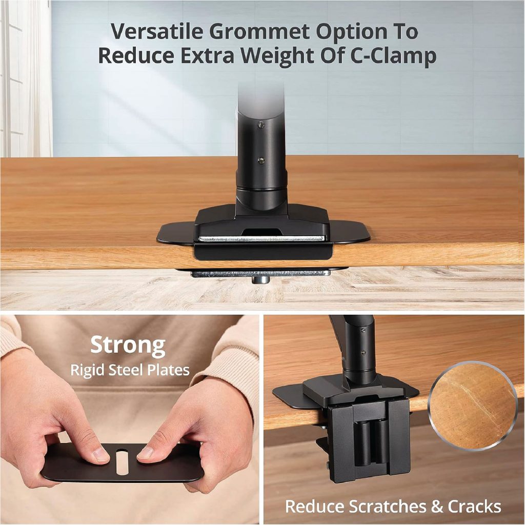 Keep monitor mount securely mounted at tabletop without damages and scratches. The unique-designed reinforcement plates enhance stability of monitor mounts by disperse the compressing force across larger area.