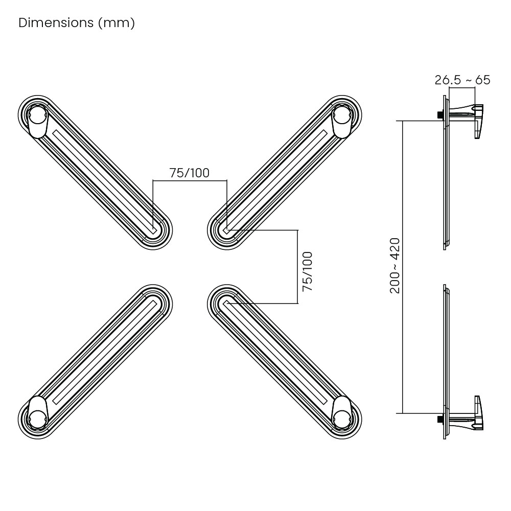 The XMA-01 offers an innovative mounting solution for you to mount monitors without VESA compatibility to a monitor desk or wall mount. The adapter is designed to fit any VESA monitor mount with 75×75 and 100x100mm mounting holes. It uses a four-arm system to adjust to the different external dimensions of flat-panel monitors and clamp them in place securely. This adapter supports most 13″-27″ monitors with thickness of 26.5mm to 65mm. It allows your non-VESA monitor to be mounted on almost any ergonomic monitor arm and to be adjusted for improved viewing experience.